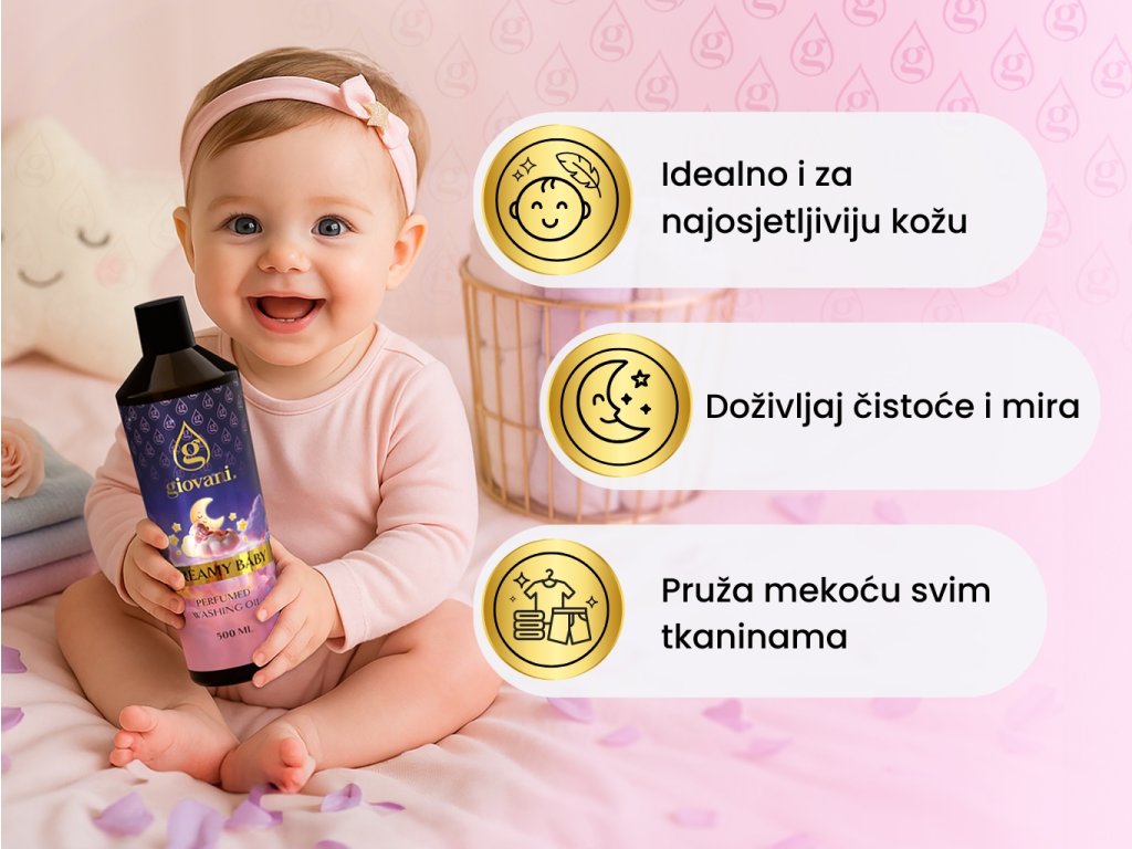 Mirisne esencije parfema za pranje Giovani® DREAMY BABY su cvjetno-puderaste s daškom svježine. Osvježavajuće zelene note i bergamot otvaraju put do nježnog srca mirisa, u kojem se stapaju cvijet naranče, ruža, jasmin, ljubičica i peruanski heliotrop. Bazne note čine baršunasti mošus, kremasta vanilija i topli sandal. Ova harmonična kompozicija razveselit će osjetila, a ujedno je nježna i prema najosjetljivijoj koži.