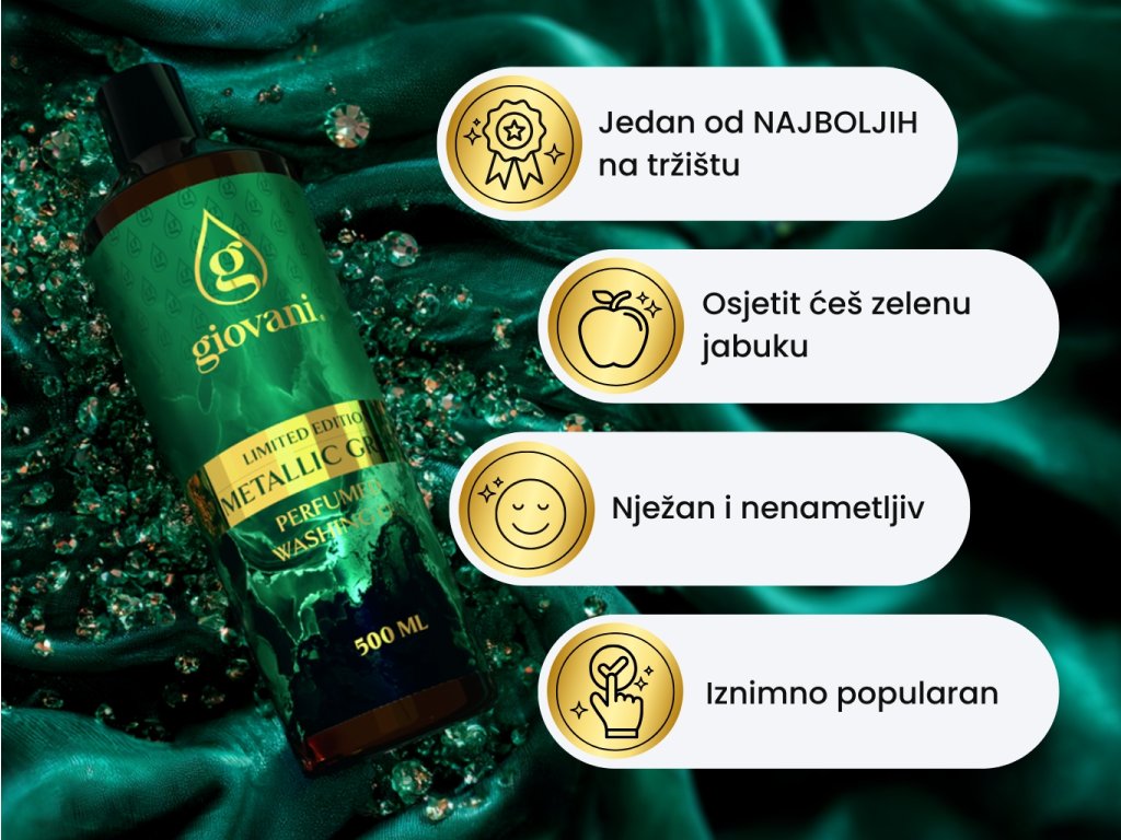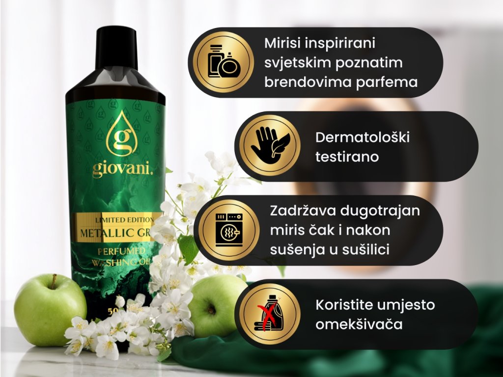 Ograničeno izdanje GIOVANI® Metallic Green kreirano je imajući na umu jedinstvenost i najintenzivnije osjećajno iskustvo. Nakon pranja, vaše rublje i dom će još dugo mirisati slatko-svježom parfemskom aromom.