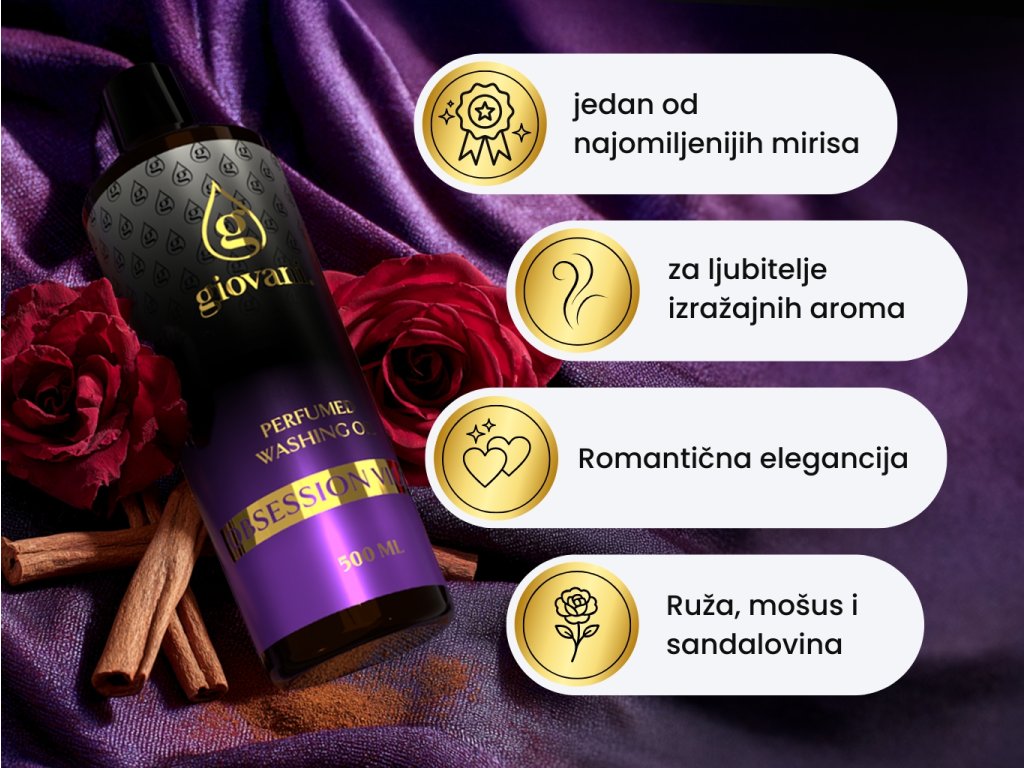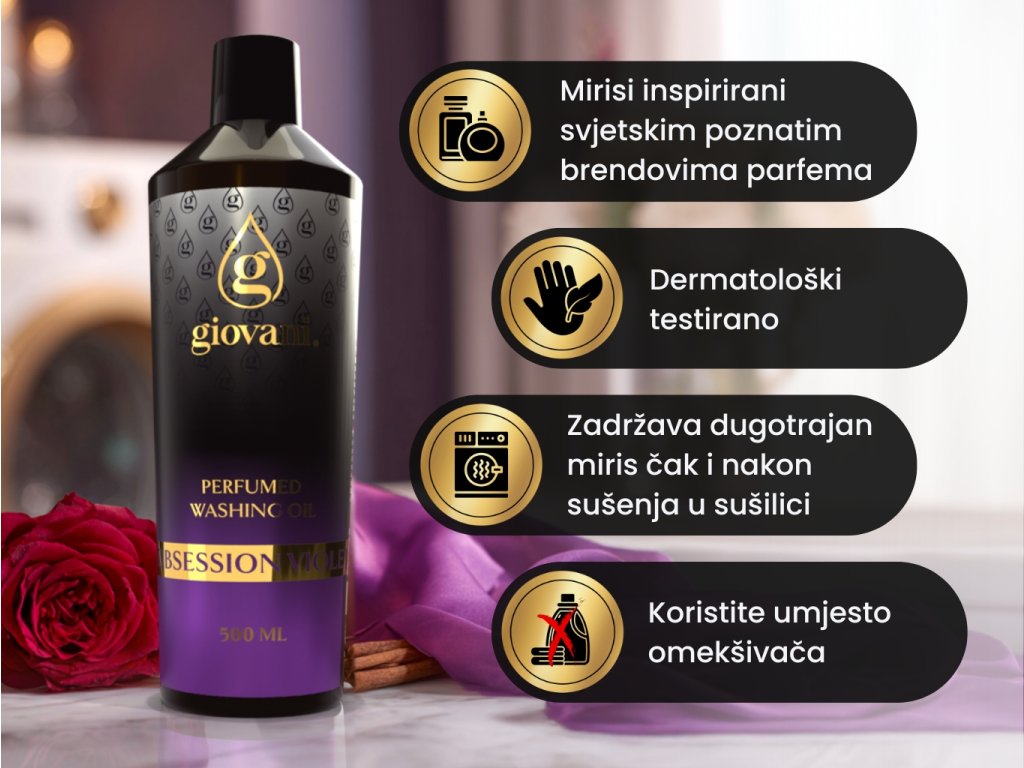 Giovani® je ekskluzivni i luksuzni brend parfema za pranje rublja. Pobrinuli smo se za njihovu visoku kvalitetu. Pri razvoju ovih mirisa bilo nam je važno postići njihov snažan intenzitet i dugotrajnost, kako bismo o Giovaniju mogli govoriti kao o najkvalitetnijem brendu parfema za pranje rublja na tržištu. Njihova velika prednost je što ne začepljuju perilicu rublja, ne ostavljaju masni trag i ne mrljaju odjeću. Zahvaljujući sadržaju nekih tvari, naša ulja također brinu o boji Vašeg rublja. Oni su veganski, bez dioksana, SVHC-a, parabena, PBT/vPvB tvari, teških metala, zagađujućih ostataka, mikroplastike ili nanoplastike. Ono što pridonosi jedinstvenosti brenda Giovani® je njegov luksuzni dizajn. Također se možemo pohvaliti isporukom unutar 24 sata i brzom korisničkom službom. |