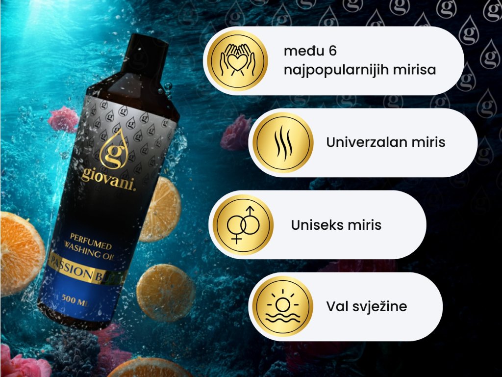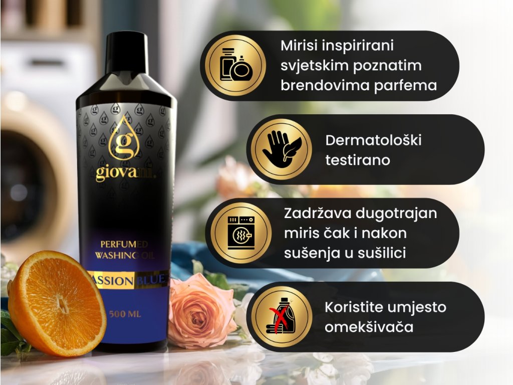Giovani® je ekskluzivni i luksuzni brend parfema za pranje rublja. Pobrinuli smo se za njihovu visoku kvalitetu. Pri razvoju ovih mirisa bilo nam je važno postići njihov snažan intenzitet i dugotrajnost, kako bismo o Giovaniju mogli govoriti kao o najkvalitetnijem brendu parfema za pranje rublja na tržištu. Njihova velika prednost je što ne začepljuju perilicu rublja, ne ostavljaju masni trag i ne mrljaju odjeću. Zahvaljujući sadržaju nekih tvari, naša ulja također brinu o boji Vašeg rublja. Oni su veganski, bez dioksana, SVHC-a, parabena, PBT/vPvB tvari, teških metala, zagađujućih ostataka, mikroplastike ili nanoplastike. Ono što pridonosi jedinstvenosti brenda Giovani® je njegov luksuzni dizajn. Također se možemo pohvaliti isporukom unutar 24 sata i brzom korisničkom službom. |