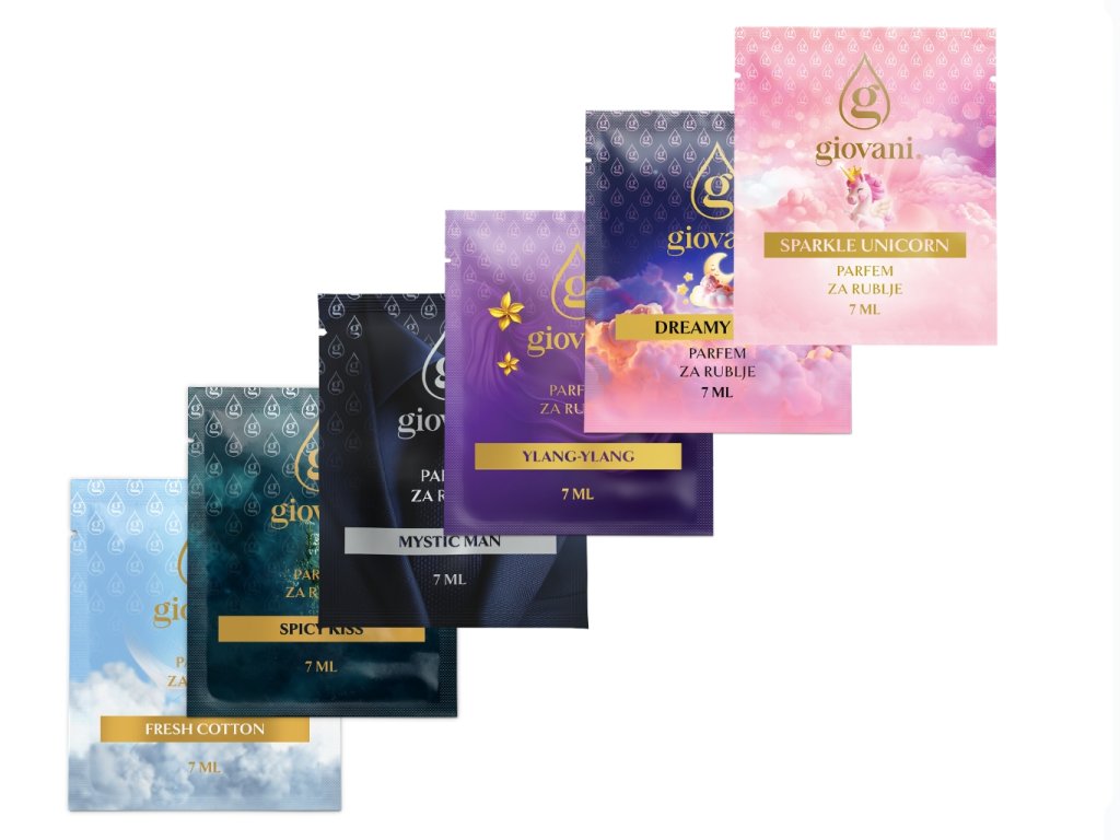 Giovani® je ekskluzivni i luksuzni brend parfema za pranje rublja. Pobrinuli smo se za njihovu visoku kvalitetu. Pri razvoju ovih mirisa bilo nam je važno postići njihov snažan intenzitet i dugotrajnost, kako bismo o Giovaniju mogli govoriti kao o najkvalitetnijem brendu parfema za pranje rublja na tržištu.